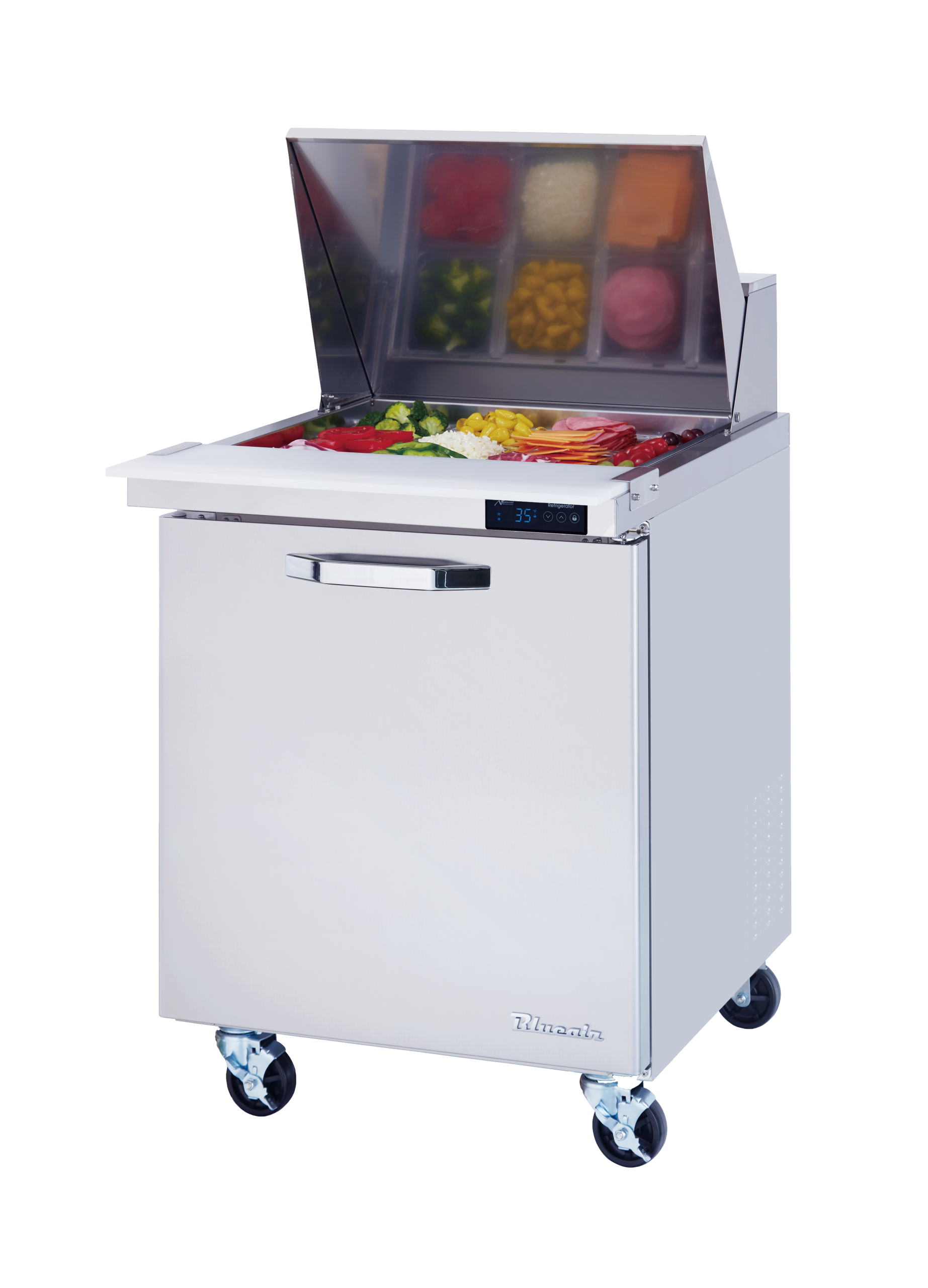 *SHOWROOM* *FREIGHT DAMAGE* NEW & UNUSED Mega Top Sandwich Prep Table, one-section, 27-1/2"W, 7.0 cu. ft. capacity, rear-mounted self-contained refrigeration, (12) 1/6 size pan capacity (included), (1) self-closing swing door, (1) adjustable wire shelf, 9-1/2" cutting board, side rail cutting board bracket, 33° F to 39° F temperature range, insulated pan cover with stainless steel divider, stainless steel interior & exterior, (4) 4" swivel casters (2 braked), R290 Hydrocarbon refrigerant, 1/4 HP, 115v/60/1-ph, 4.1 amps, cord with NEMA 5-15P, cETLus, ETL-Sanitation