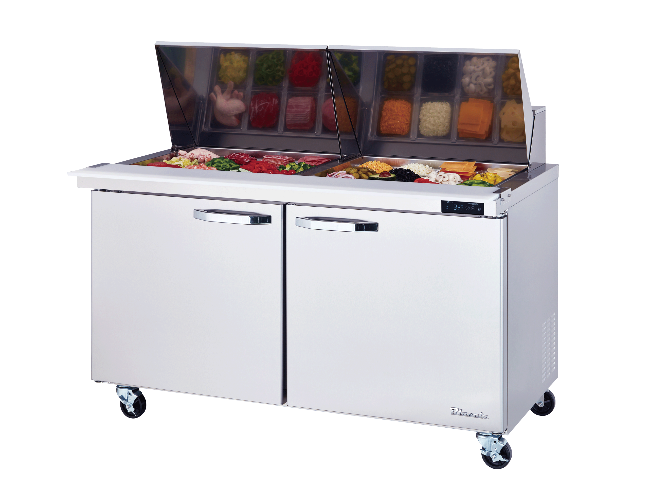 *FREIGHT DAMAGE* NEW & UNUSED Mega Top Sandwich Prep Table, two-section, 60-3/8"W, 16.7 cu. ft. capacity, rear-mounted self-contained refrigeration, (24) 1/6 size pan capacity (included), (2) self-closing swing doors, (2) adjustable wire shelves, 9-1/2" cutting board, side rail cutting board bracket, 33° F to 39° F temperature range, insulated pan cover with stainless steel divider, stainless steel interior & exterior, (4) 4" swivel casters (2 braked), R290 Hydrocarbon refrigerant, 1/4 HP, 115v/60/1-ph, 4.9 amps, cord with NEMA 5-15P, cETLus, ETL-Sanitation